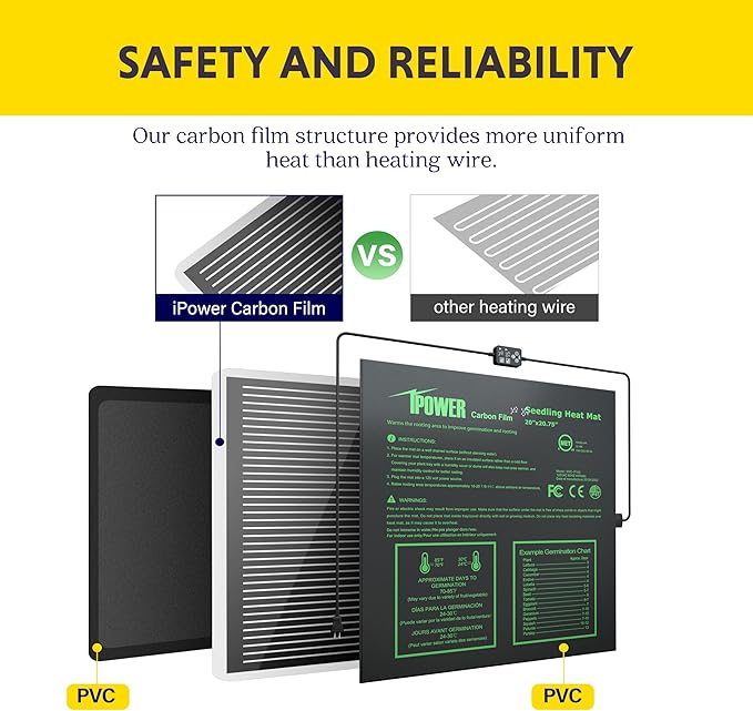 - Innovative Heating: Heating film structure ensure uniform heating. Warms root area 10-20℉(5-11℃) over the ambient air temperature, which will increase the success of seedlings and cuttings