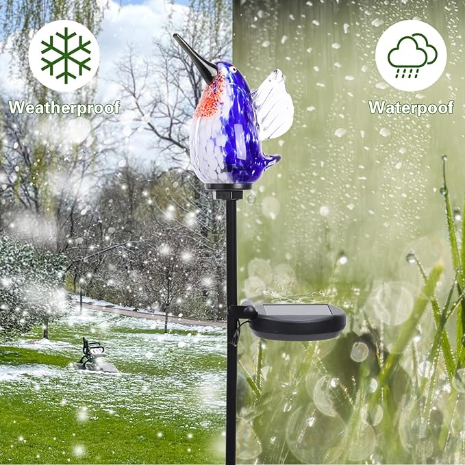 Afirst Decorative Solar Lights Outdoor Solar Hummingbird Stake Lights Hand Blown Glass Decorative Garden Pathway Light Outdoor Waterproof Glass Stakes Blue