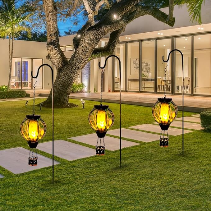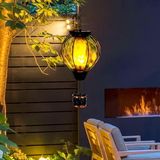 - Hot Air Balloon Solar Lantern: The solar lanterns outdoor waterproof has a unique design that incorporates the classic elements of a hot air balloon.Its shape resembles a hot air balloon floating in the air,with a candlestick hanging below.Coupled with the flickering flame design and Green spot pattern,the outdoor solar lantern is full of dreamy atmosphere,creating a warm and romantic atmosphere for your garden