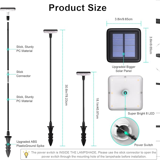 - Easy To Install: Our solar lights garden are easy to install with no wiring required, making them an effortless addition to outdoor; Whether you’re hosting evening gatherings or simply enjoying a quiet night outdoors, the solar swaying lights offer both functionality and charm to any outdoor setting; 1.Press "ON" button in lamp head by stick; 2.Assemble stick connectors by using 1 or 2 stick (2 different total height: 18.1 inchs or 30.8 inchs); 3.Put them under sun and shining brightly at night