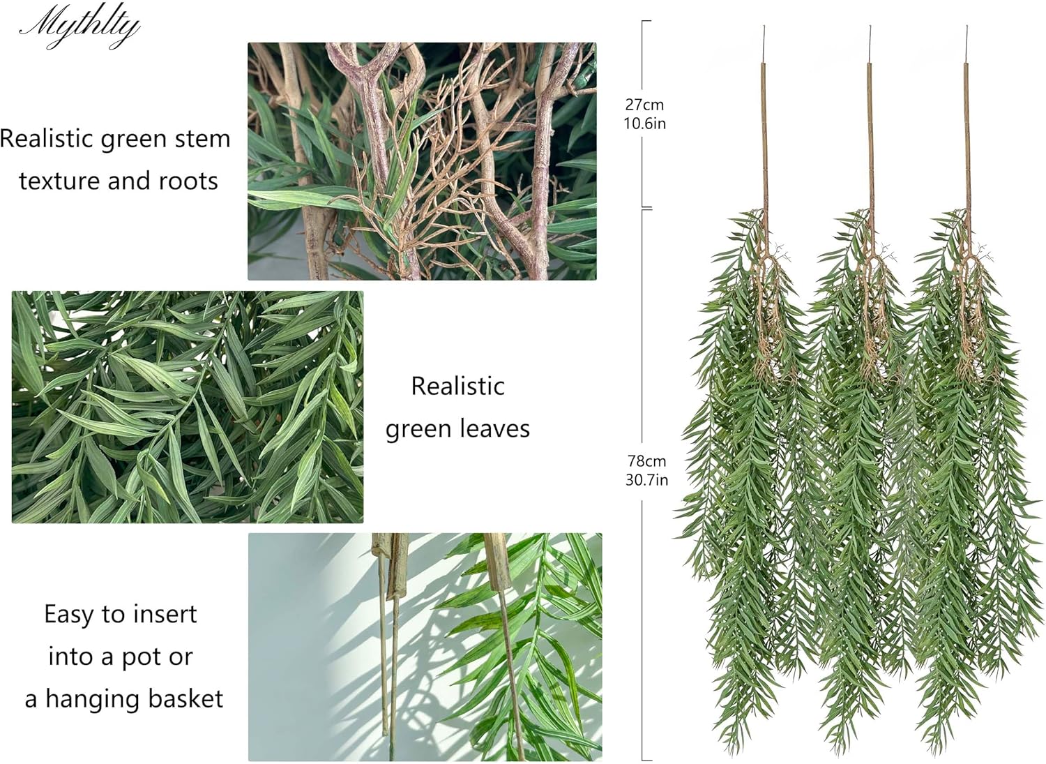 - Feature & Quality: The greenery stems of faux hanging plants made of high-quality metal wire wrapped in plastic which makes it more flexible, leaves and roots are made of plastic, these fake hanging stems look realistic and lifelike, It can be inserted into a pot or a hanging basket to decortive home indoor or outdoor porch