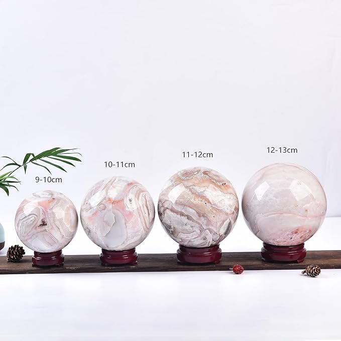 - Size:This pink agate crystal ball sphere measures between 120-130mm,with a display stand.Naturally mined crystals,retaining their natural texture,are carved with the Sphere shape.It stands out with a gentle and attractive crystal glow