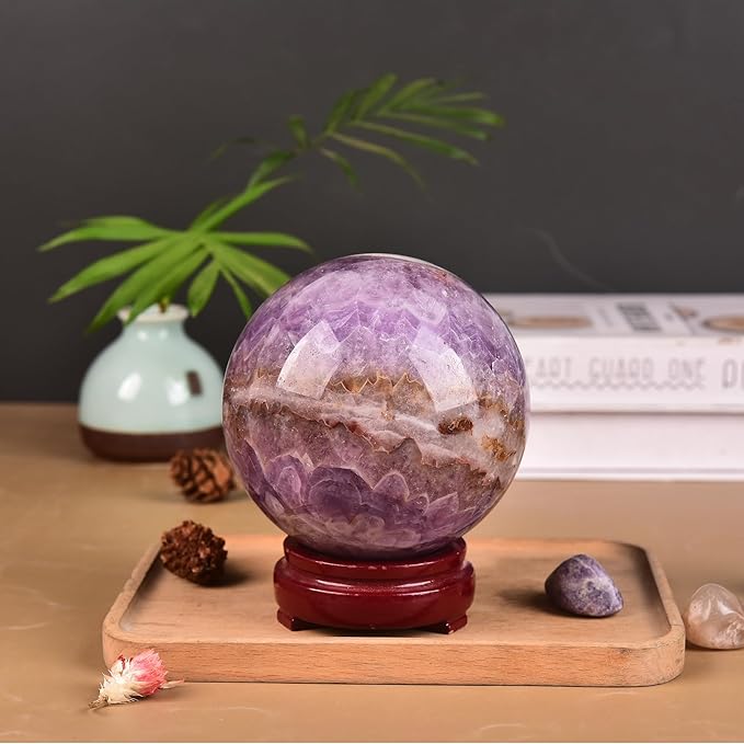 JIC Gem Large Healing Crystal Sphere Ball with Wooden Stand Amethyst Agate Crystal Decorative Ball Meditation Feng Shui Decor 90-100mm
